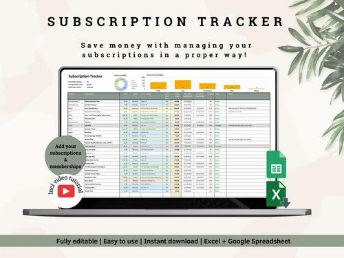 Subscription Tracker: Manage Recurring Costs online with this digital subscription spreadsheet (Excel & Google Sheets) 12-month Membership